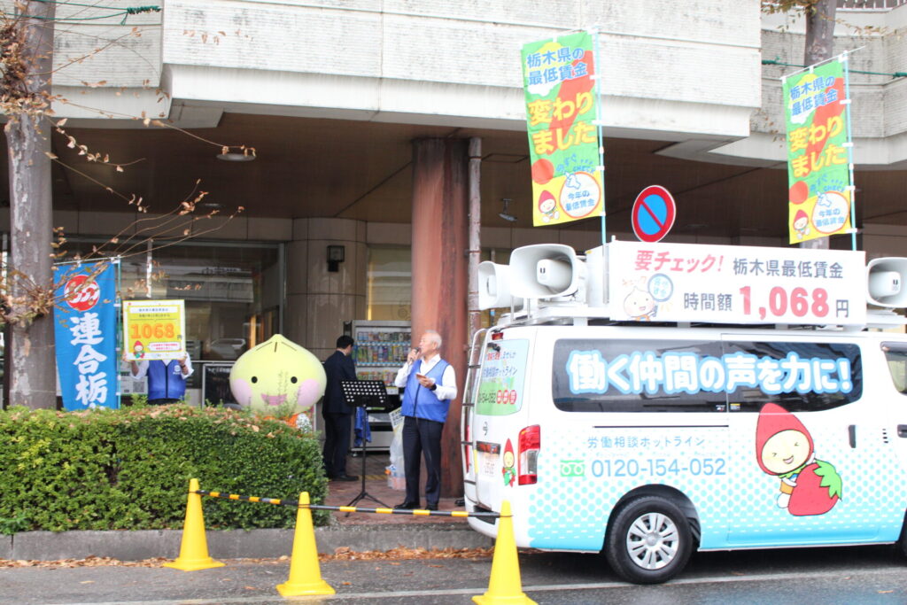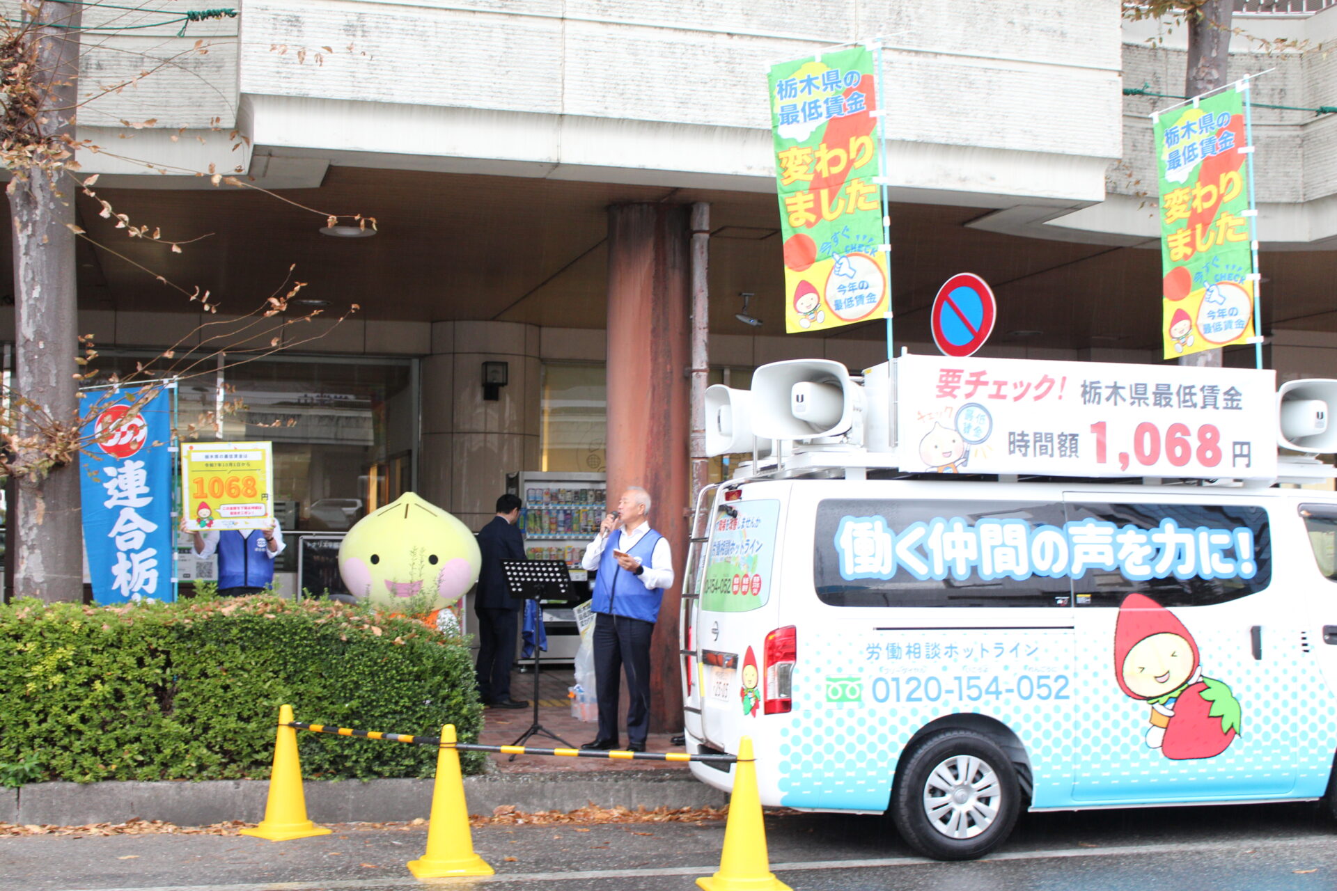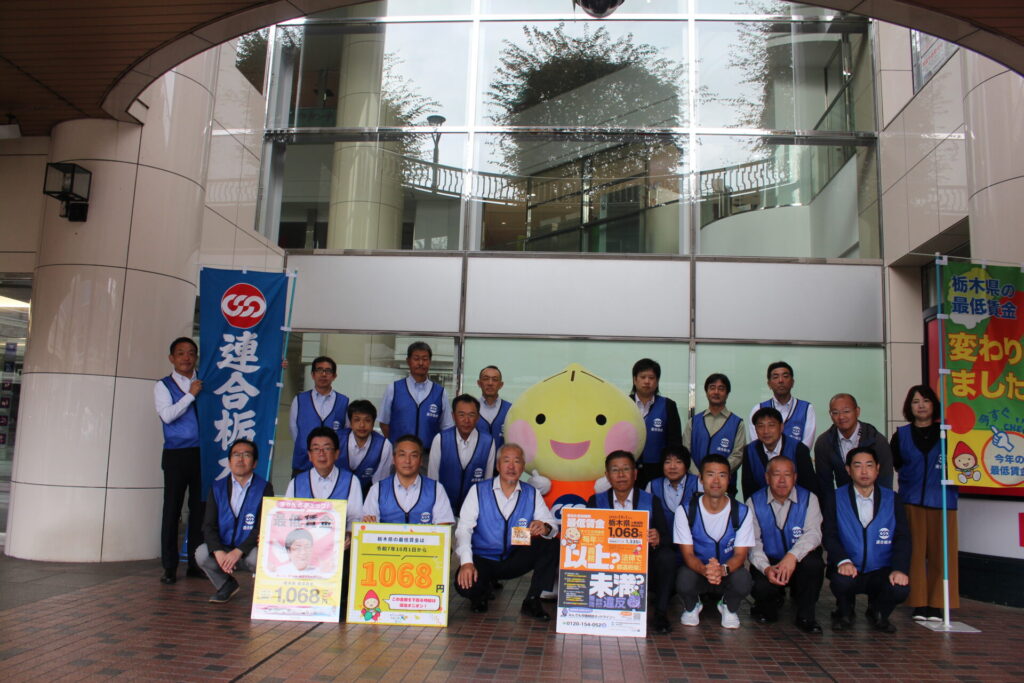 最低賃金が改正になったことを、みなさんに知っていただくため、10月1日の朝に、JR宇都宮駅前にて周知活動を行いました。