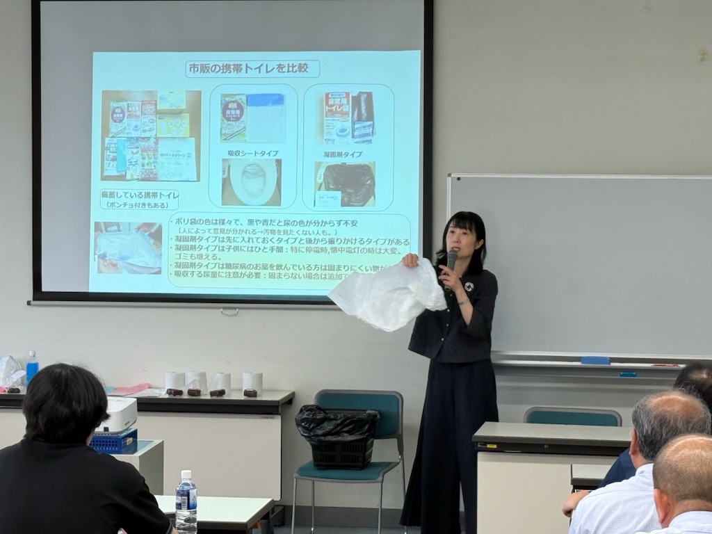 大規模災害のたびに、繰り返しトイレが問題になっており、特に被災経験者から聞いた家庭のトレイ状況として、臭いや水の備蓄といった課題があげられています。被災地では出来るだけトイレに行かないように食事や水分摂取を控える人もいて、栄養状態の悪化や脱水症状を招くことがあるとし、今泉先生は「トイレ問題は命にかかわります」と指摘。また、携帯トイレを備蓄するだけでなく、非常時のうちに一度使っておくことがお薦めであるとし、臭いはどうか、処分方法はどうしたらよいか、慣れておく必要もあるとしました。