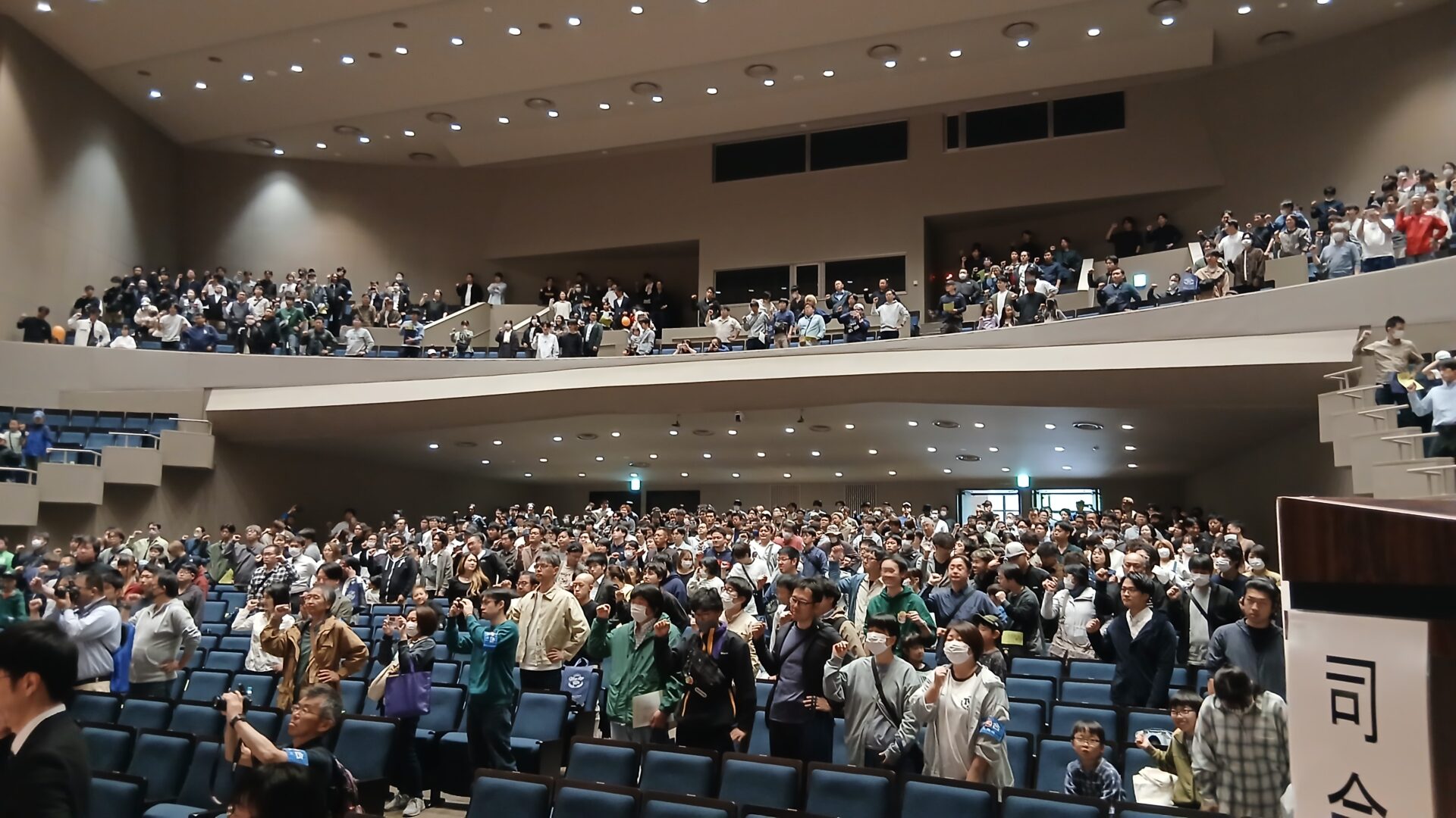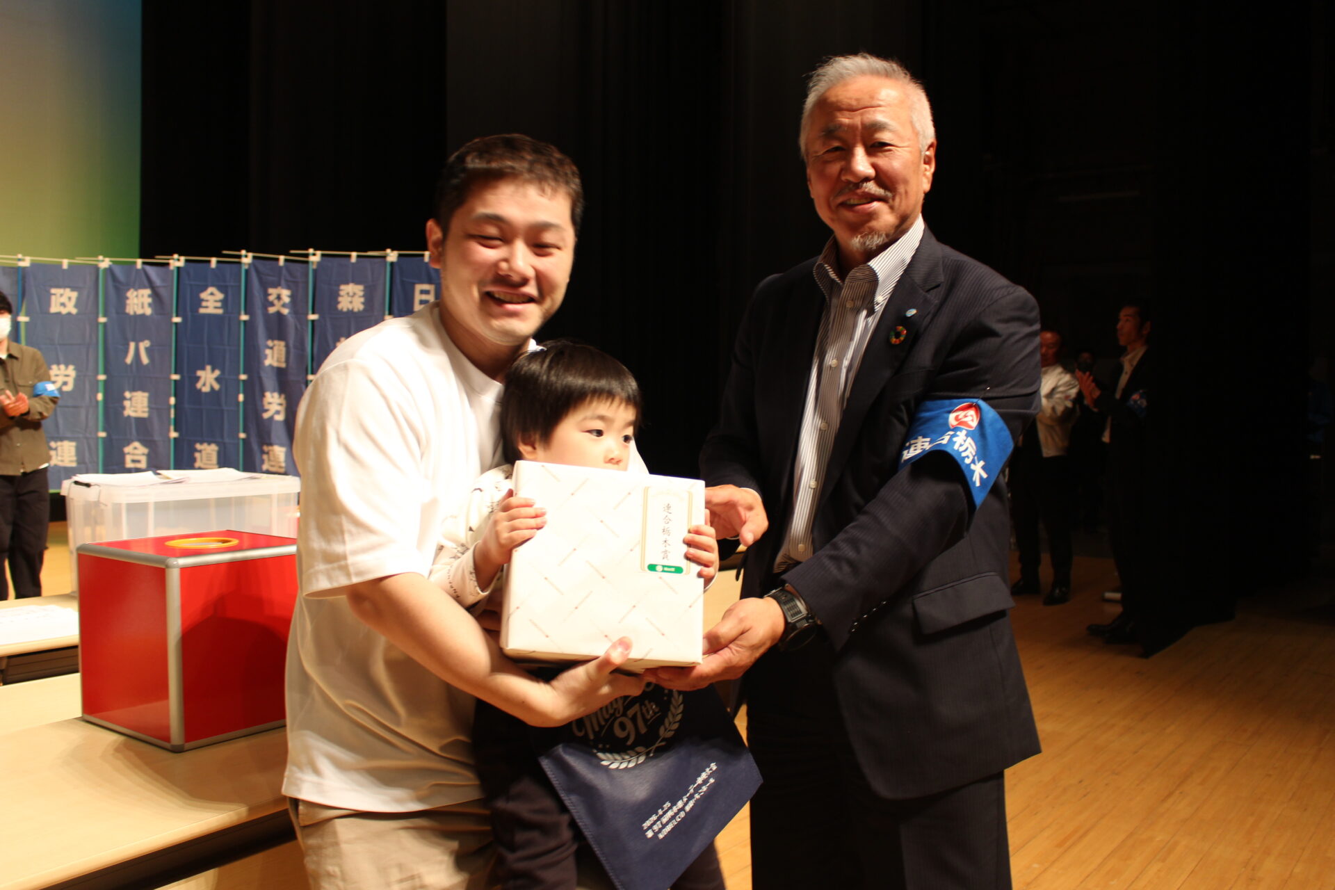 式典ではスローガンを全体で確認した後、「ガンバロー三唱」で結束を固め、盛会のうちに終了。続く第2部の抽選会も大いに盛り上がり、参加者の笑顔が広がりました。