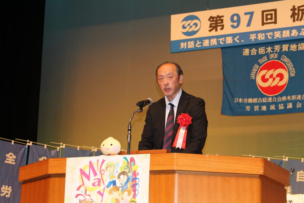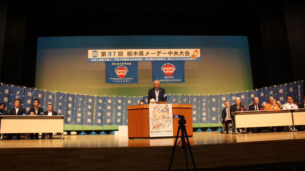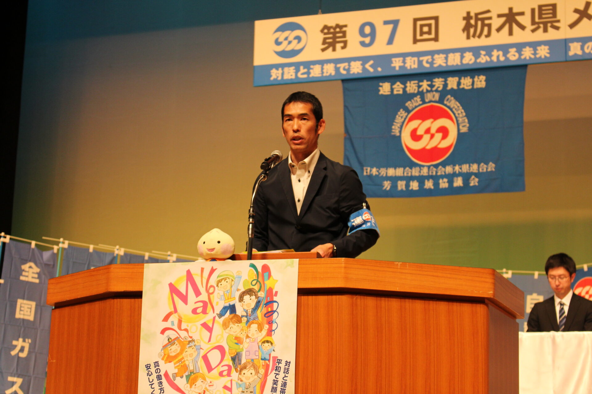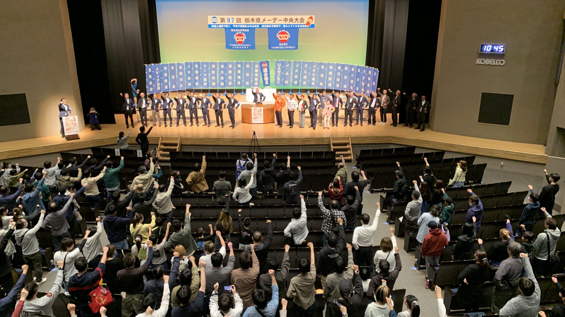4月25日(土)、第97回栃木県メーデー中央大会が真岡市のKOBELCO真岡いちごホールにて開催されました。