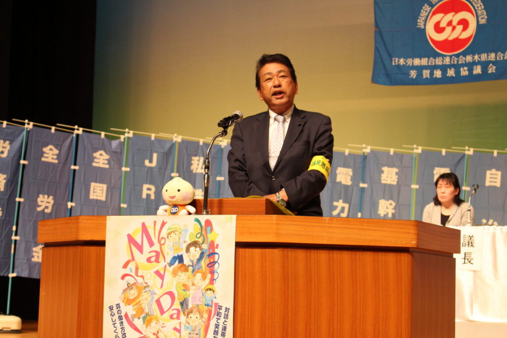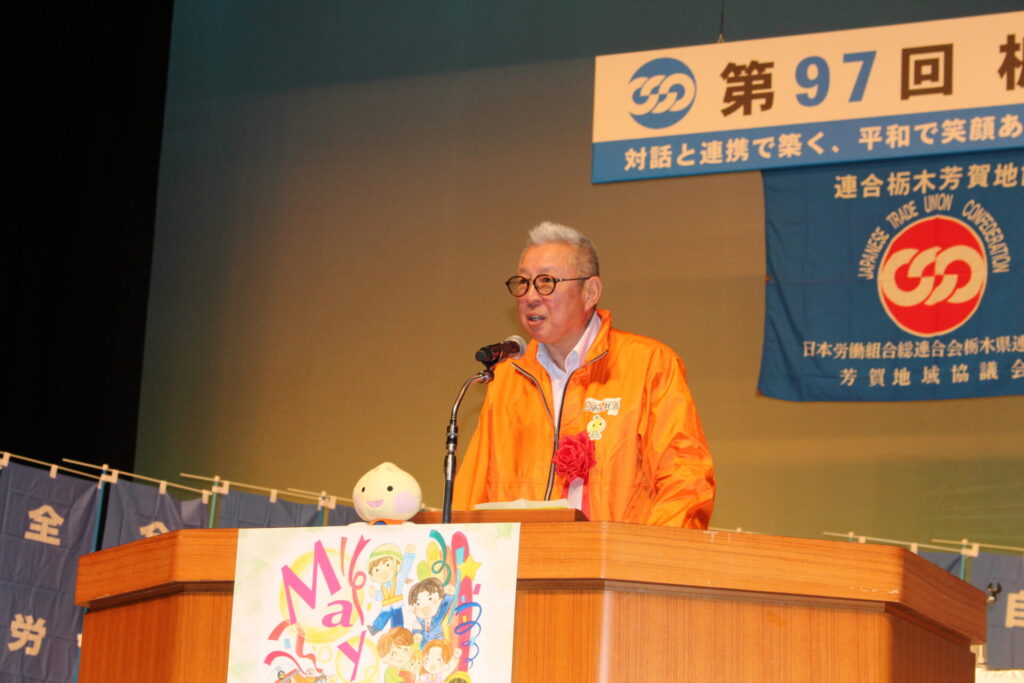 主催者あいさつでは、メーデー実行委員長である連合栃木の中島会長が、「今春闘で生まれた賃上げの流れを、すべての働く仲間へと広げていくことが重要だ」と強調。あわせて「生活が良くなったと実感できる社会の実現に向け、仲間との連帯をさらに広げ、深めていこう」と呼びかけました。
