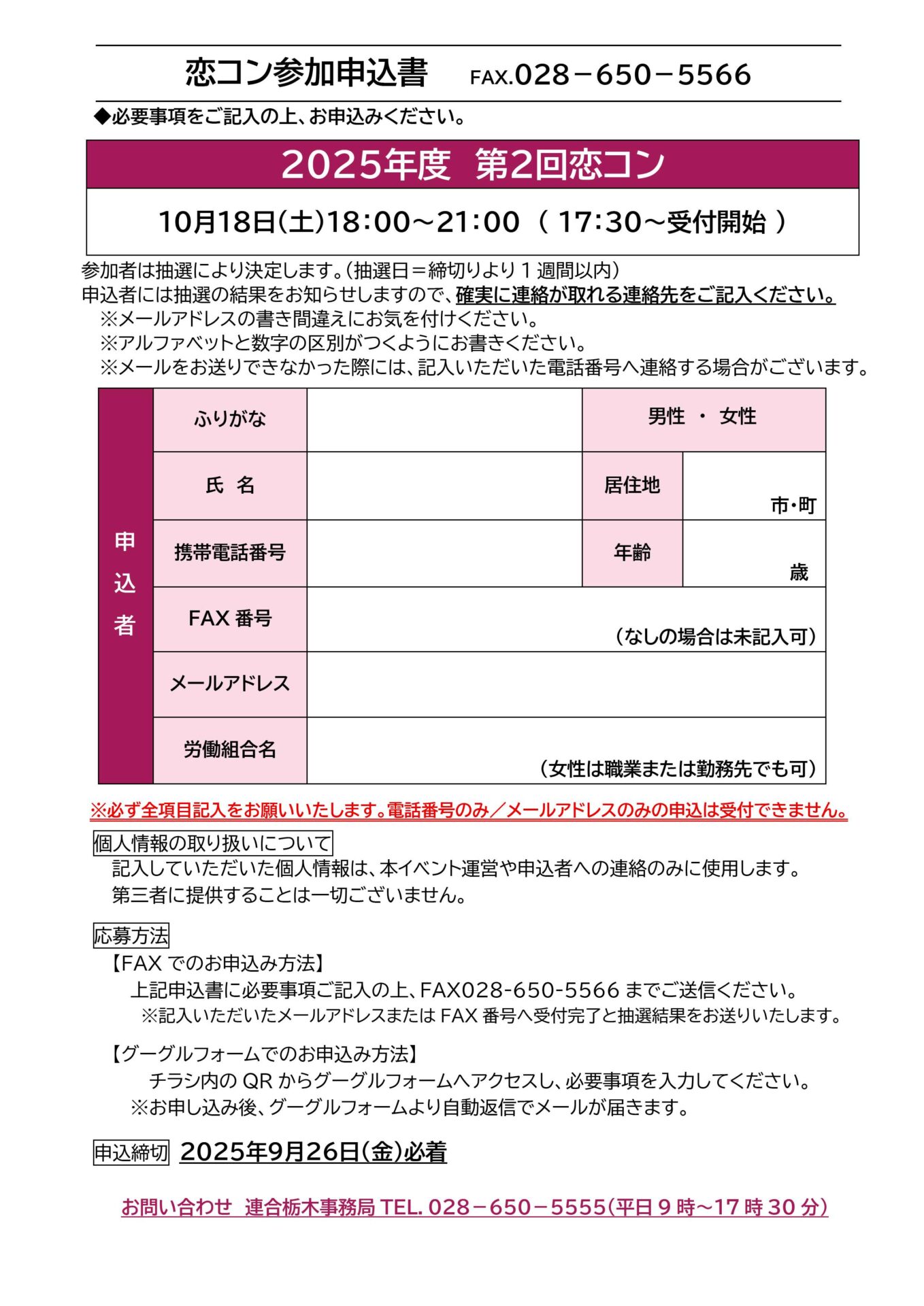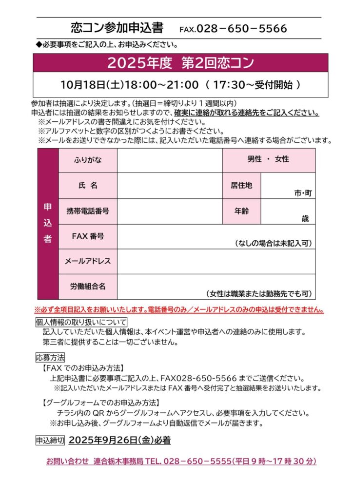 お問い合わせ:連合栃木「恋コン」事務局(028-650-5555)